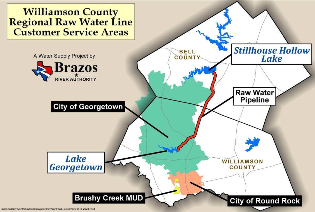 The Williamson County Regional Raw Water Line (WCRRWL) delivers raw water from Stillhouse Hollow Lake to Lake Georgetown for the three Williamson County providers. Without the line, the supply stored in Lake Georgetown would not meet local needs during droughts. Thankfully, there is the neighboring Stillhouse Hollow Lake, which is roughly four times larger than Lake Georgetown and can help meet demand.