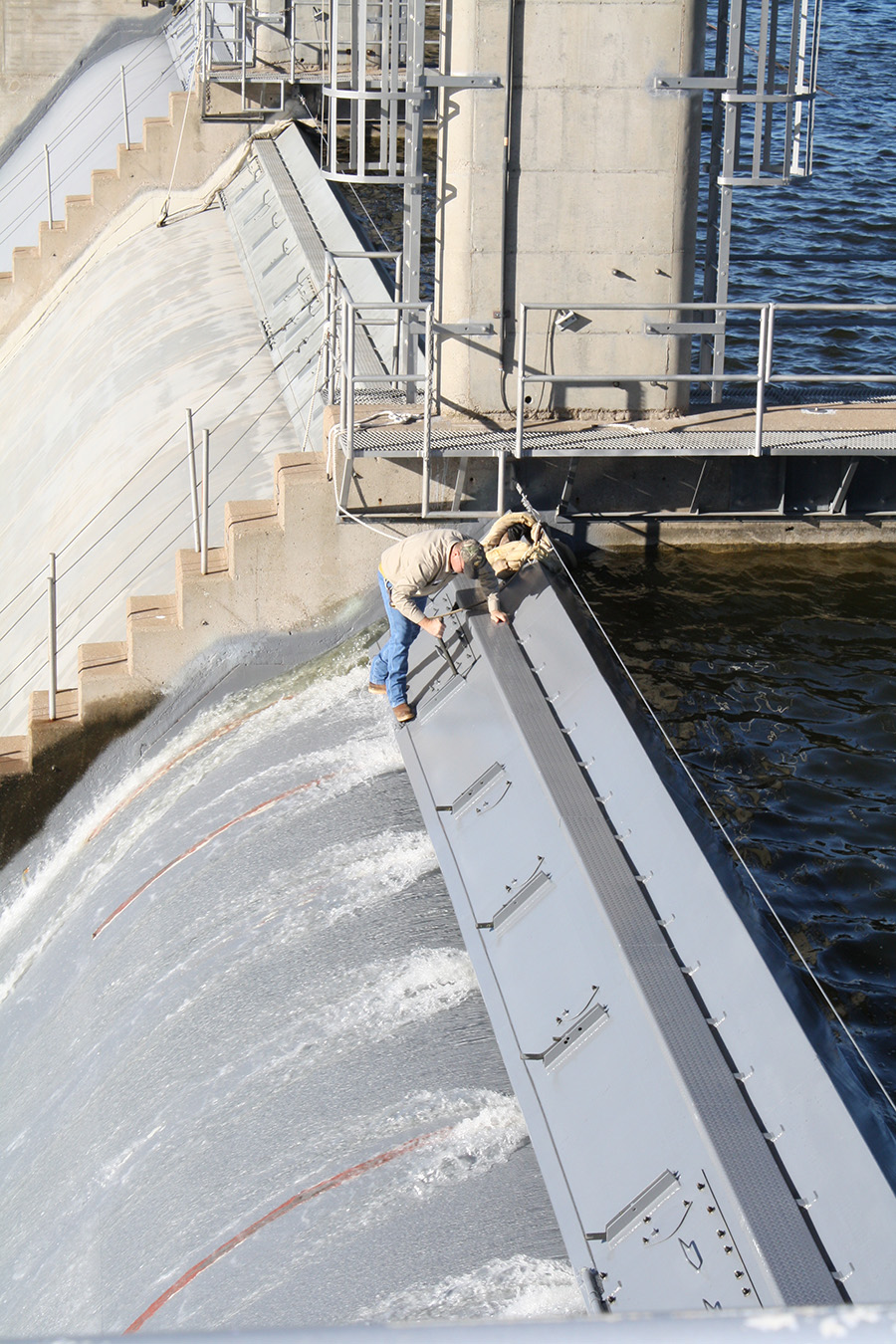 Once the floating status is secured, this process requires a BRA employee, attached by a tether above a 130-foot drop, to physically climb on top of the gate to unlatch a series of locking bars that secure the gate in the closed position when not in use. The gates are accessed via a catwalk that runs the length of the gates.
