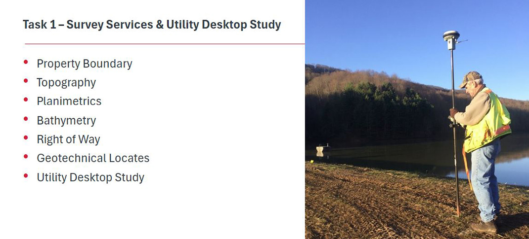 - Surveying services and utilities, including assessing the topography for conceptual design, identifying known utilities within the property, and evaluating potential impact to reservoir design, among other things.