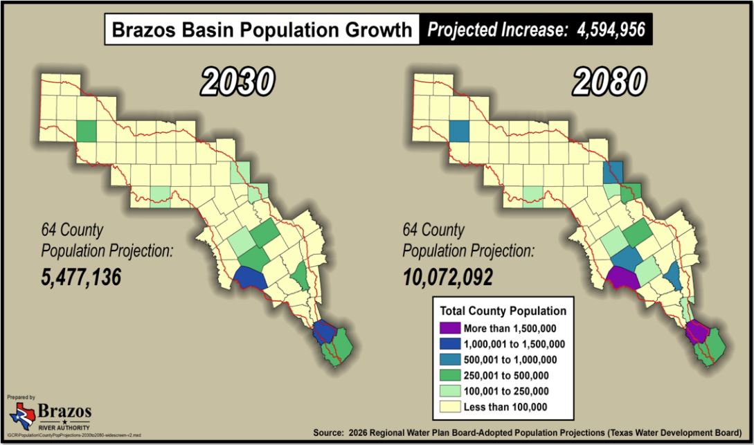 Between 2030 and 2080, the population of the Brazos River Basin is expected to increase by a staggering 4.6 million people, bringing the total up to more than 10 million residents, according to the 2026 Regional Water Plan.